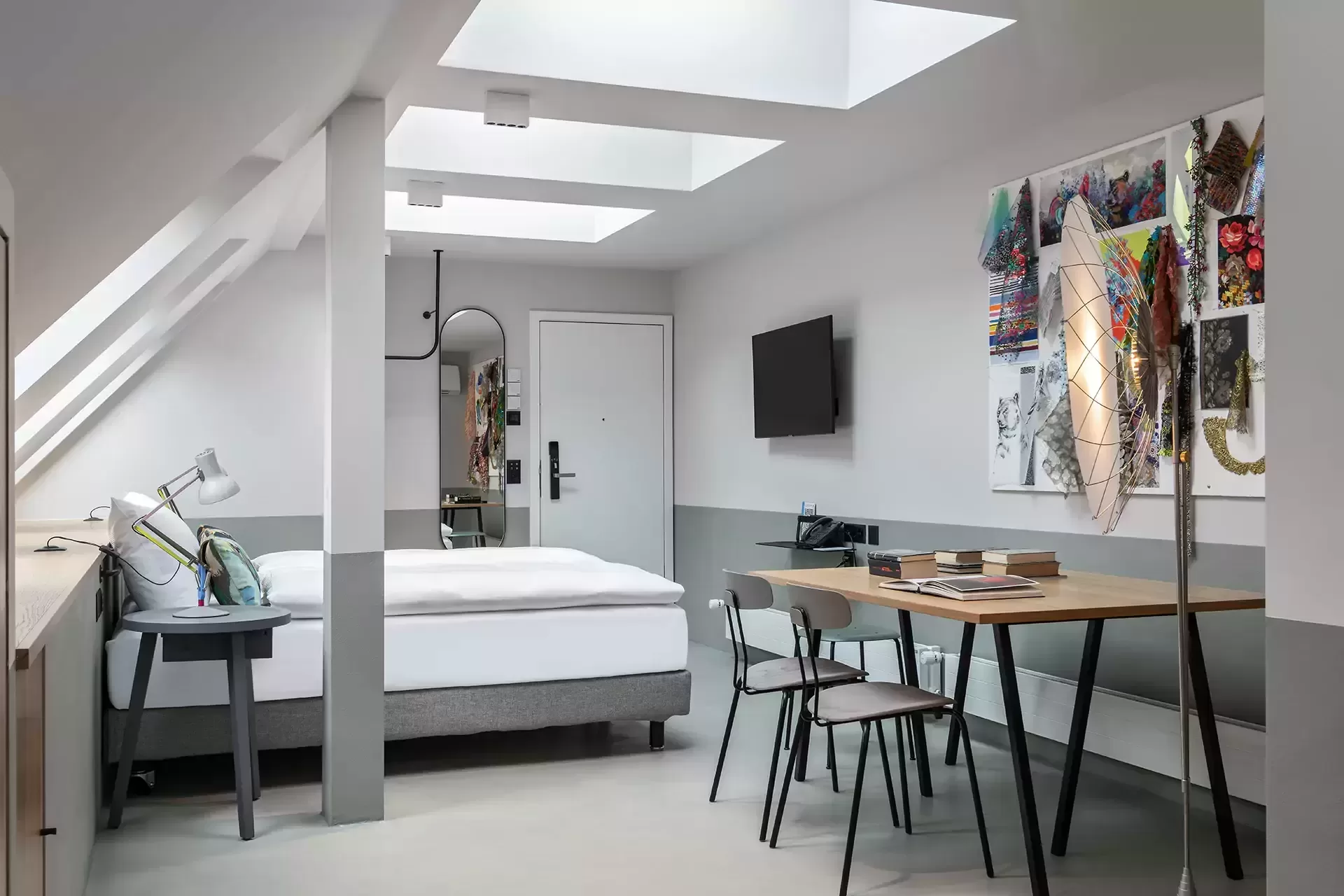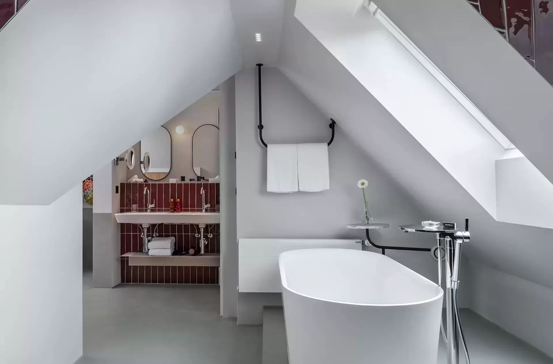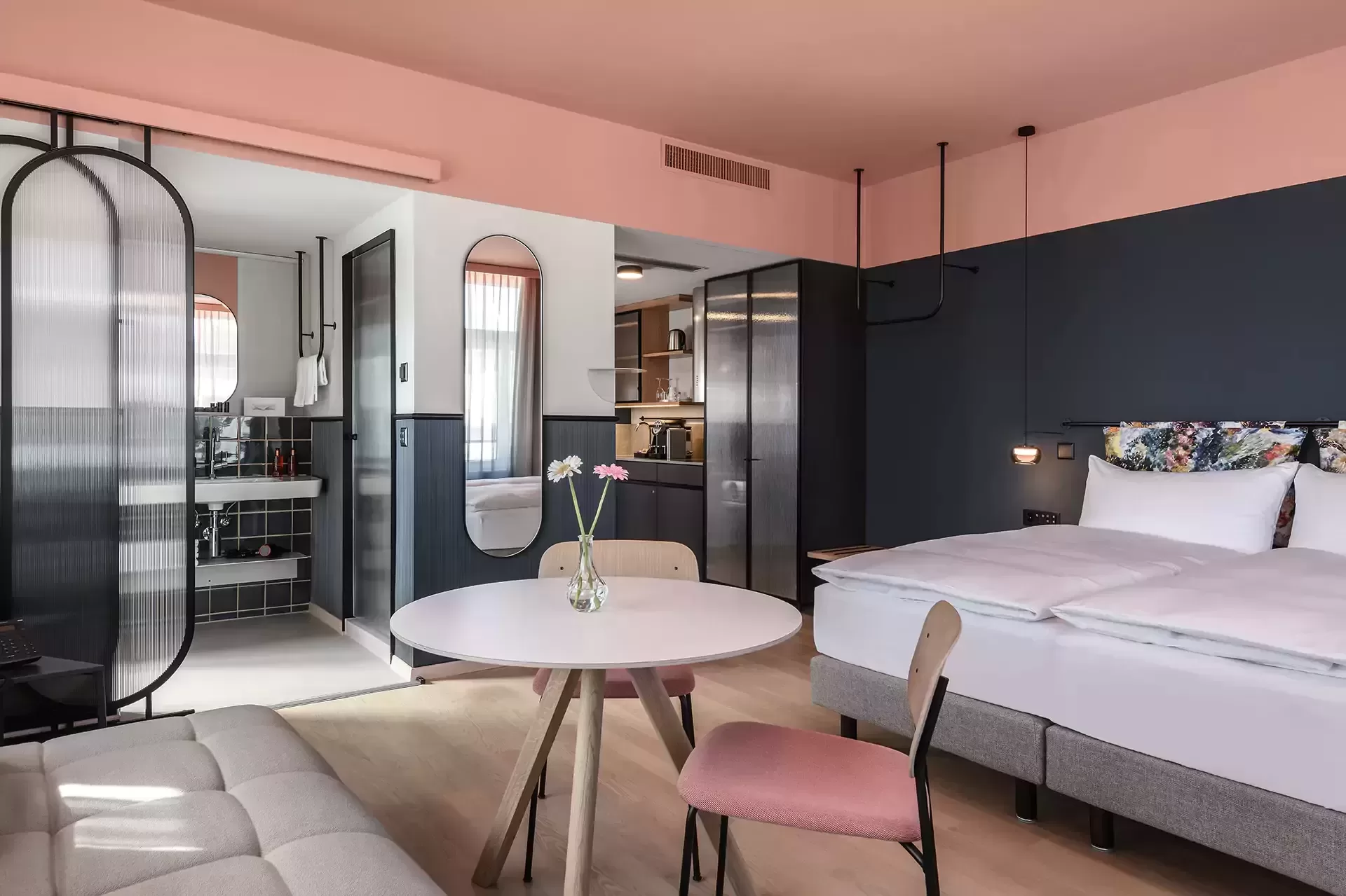 We delivered 32 contemporary rooms, 20 of which are specially equipped with a kitchenette for long-term stays. Each room comes with all the modern comforts, including air conditioning and ventilation system, minibar, Nespresso coffee machine, TV, media hub, Wi-Fi, a safe with integrated sockets, a desk and a rain shower. These facilities guarantee a thoroughly pleasant and comfortable city break. Two multifunctional seminar rooms have also been established in the basement of the building, which can be used by both hotel guests and external visitors, emphasising the flexibility and versatility of the project.