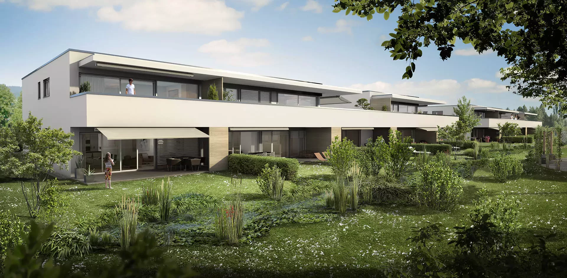 The charming, two-storey residential buildings have two 3½-room apartments, two 4½-room apartments and one 5½-room apartment on the ground floor, all with direct access to cosy, sheltered seating areas. Attractive 4½- and 5½-room apartments with spacious, sheltered terraces of up to 127 m² have been created on the top floor. Both the seating areas and the terraces are equipped with sun awnings to provide pleasant shade. Each apartment has two bathrooms, its own washing machine and tumble dryer, a comfort ventilation system and a cellar compartment, guaranteeing a high level of living comfort.